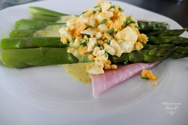 Ik leg een plak ham op het bord de asperges erop saus erover en dan het ei erover strooien.