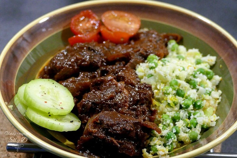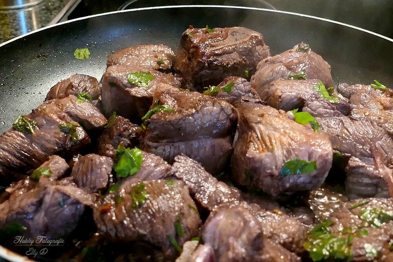 het vees kookt helemaal in en de smaken zitten in het vlees.