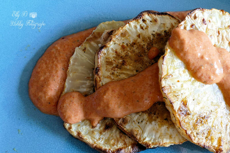 Knolselderij smaakt overal bij. en zeker met deze lekkere paprikasaus.