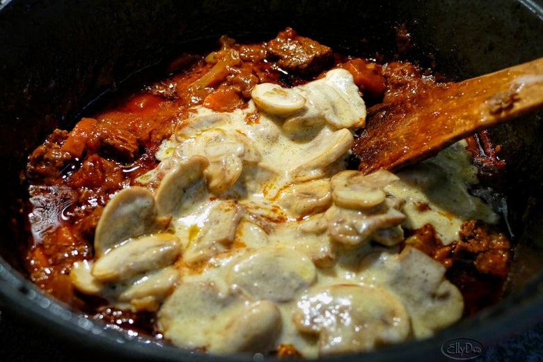 Een pakje kookroom erbij en als de champignons gaar zijn voor het opdienen door de pan vlees roeren