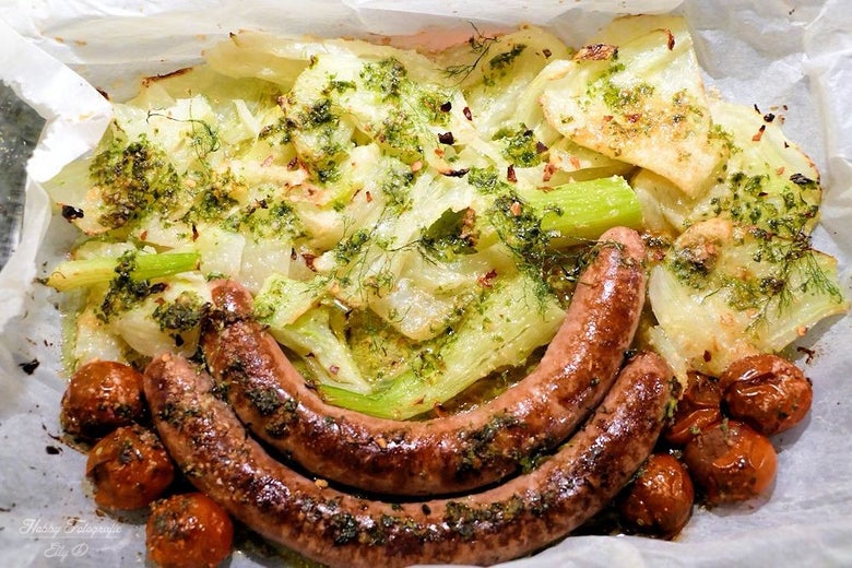 En dan de oven in voor ongeveer 25 minuten tot je de Venkel wat bruin ziet worden