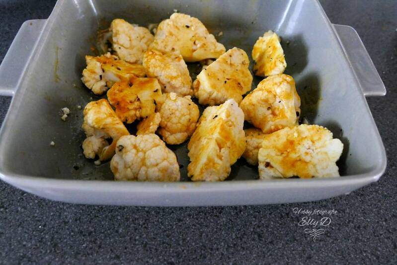 bloemkool in ovenschaaltje bestrooien met kurkuma en zwarte peper en olijfolie erover