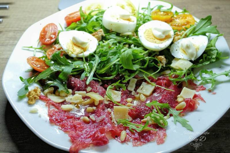 Een gezonde lunch vandaag rucola met carpaccio ,ei, tomaat, dressing, en noten , een paar vlokjes
