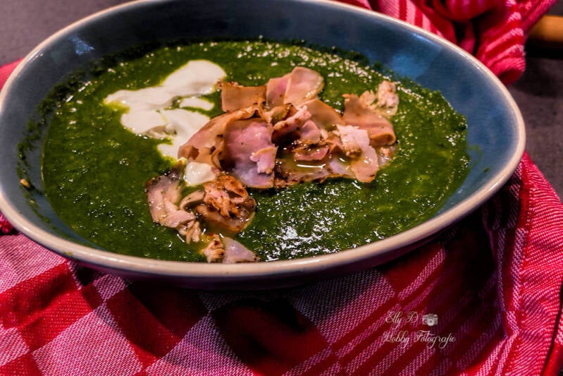 Lekker lunchen ,de soep in een kom lepeltje crème frache erin en de gebakken ham erop.