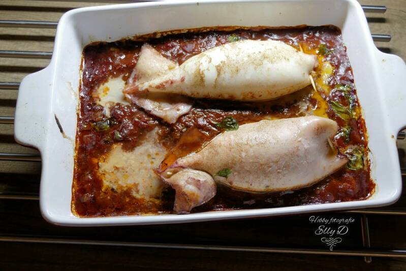 Tomatensaus in de ovenschaal en de inktvis erop leggen .