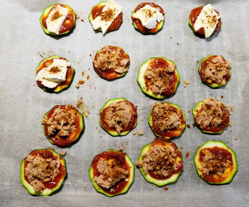 Tonijn was op, heb ik op de overgebleven courgette een plakje brie gelegd .